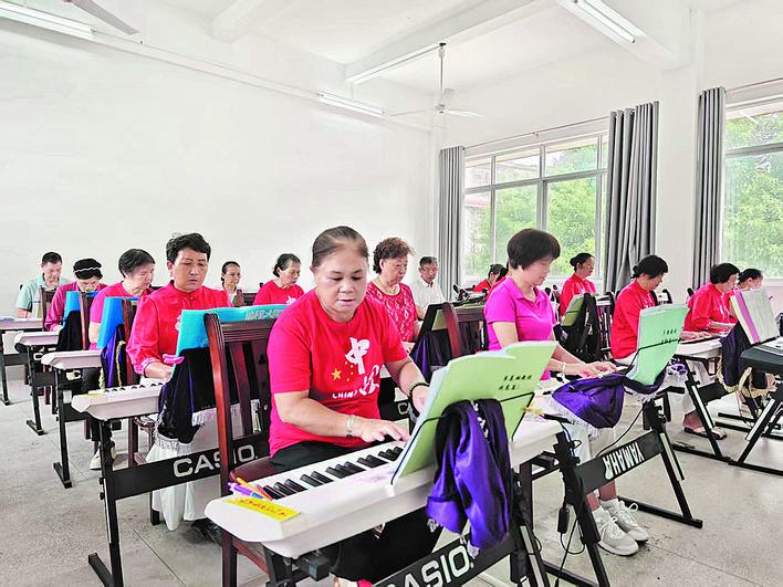 ▲老年大学电子琴班的学员在弹奏乐曲。