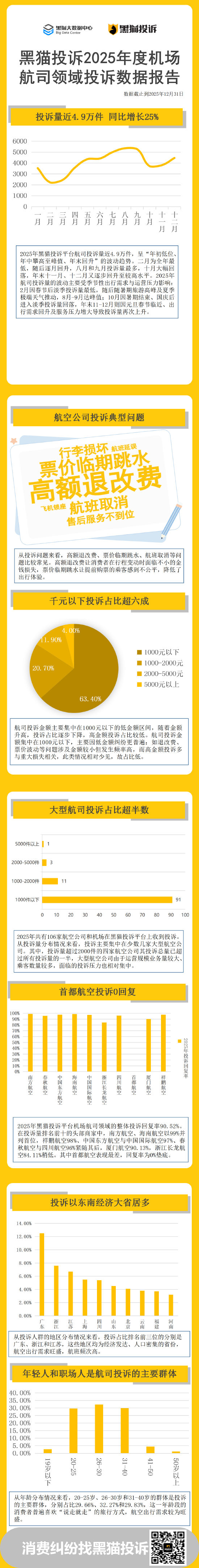 黑猫大数据中心联合黑猫投诉 【下载黑猫投诉客户端】平台发布《黑猫投诉2025年度机场航司领域投诉数据报告》,通过投诉数据盘点2025年行业趋势、行业热点问题等,通过投诉数据变化情况回顾行业消费趋势。